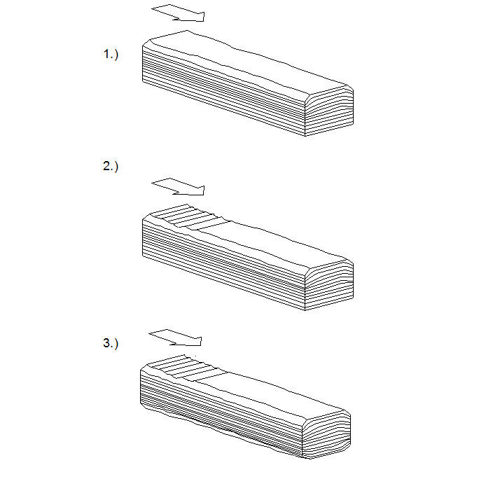 Damit das Modul während der partiellen Bearbeitung keine Einkerbung im Übergangsbereich - von Vierkant- auf Rundprofil - erleidet, ist der "Einlauf" der Anken mit einem Übergangsradius zu versehen. Diese Art des Pressens stellt weitestgehend sicher, dass auch die Kernzonen die für das Glühen notwendige Umformung erfahren. Es ist zusätzlich eine sehr schnelle Umformungstechnik, welche innerhalb weniger Minuten eine gezielte, schonende und weniger anstrengende Bearbeitung selbst kritischster Kombinationen ermöglicht. Mit dieser Technik wird die Gefahr eines Risses im Bereich der Mittellagen durch unzureichende Umformung, wie beim Schmieden mit dem Hammer, deutlich reduziert. Beachten sie, dass die Belastung sogar parallel zum Lagenverlauf ohne Rissbildung erfolgt!